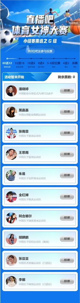 小组赛期间,您可以为所有小组的任何一位您喜爱的女神投票。
